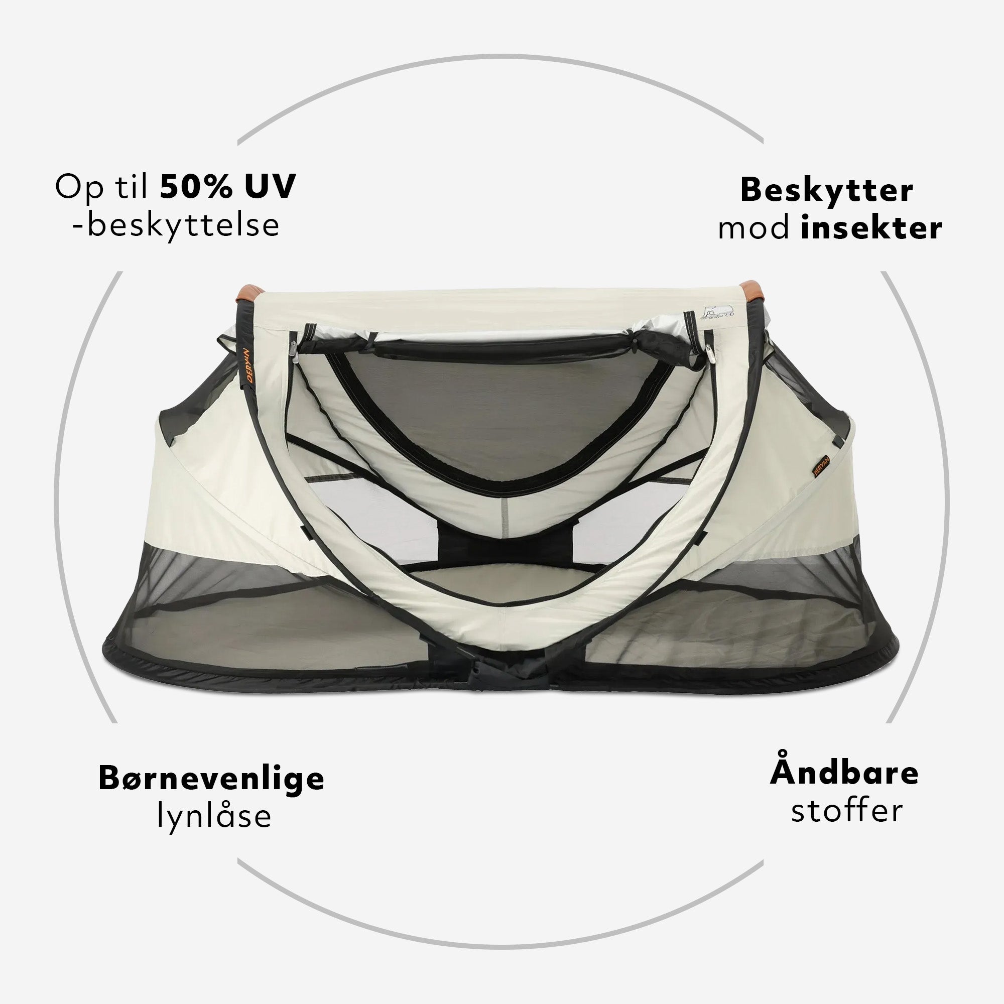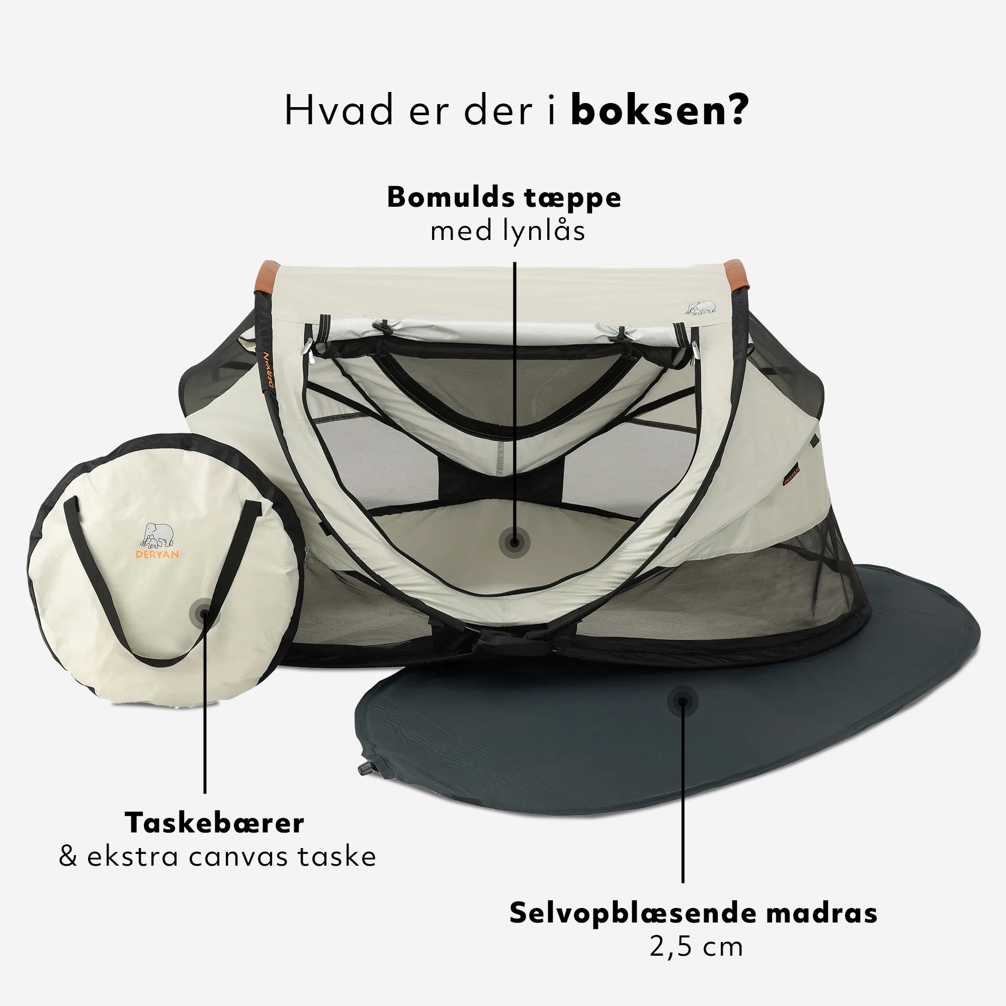 Peuter Luxe leveres komplet: Peuter Luxe, bæretaske, selvoppustelig madras 2,5 cm, bomuldsbetræk med lynlås, manual